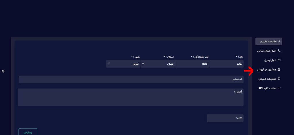 پس از ورود به تنظیمات کاربری در سمت راست بر روی گزینه همکاری در فروش کلیک کنید: